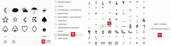 Wählen Sie in einer Textverarbeitung wie Pages im Menü Bearbeiten den Befehl Emoji & Symbole. Die bekannte Palette mit den bunten Minibildchen wird eingeblendet. Blättern Sie am unteren Rand ganz nach rechts und klicken Sie auf das Tastatur-Symbol A. Das Fenster erweitert sich deutlich. In der Kategorie Satzzeichen B, finden Sie unter den Bindestrichen C das Soft Hyphen D, das für weiche Trennungen steht. Ein Klick auf Als Favoriten sichern sorgt dafür, dass das Zeichen in Zukunft schneller zu erreichen ist.