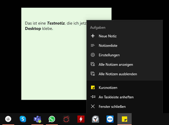 Die Notizen verschwinden alle, sobald Sie die App komplett schliessen: Rechtsklick aufs App-Symbol in der Taskleiste, gefolgt von Fenster schliessen. Die Notizen sind sofort wieder da, sobald Sie die App starten. Ein Export aller Notizen ist nicht vorgesehen. Wollen Sie den Text aus einer Notiz anderswo wiederverwenden, müssen Sie ihn in der Notiz markieren, kopieren und am Zielort erneut einfügen. Für Klebezettel-Freunde aber insgesamt eine praktische Sache, Bild 10.