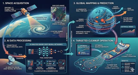 Ein neues Detektionssystem von Forschern der EPFL Lausanne, des Swiss Data Science Center und weiterer Schweizer Institutionen sowie der Universität Wageningen nutzt KI und Satellitenbilder zur präzisen Ortung von Müllbergen im Meer.