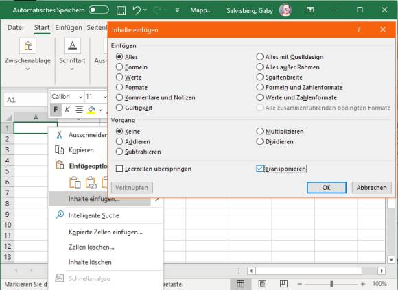 Lösung: Das Zauberwort für die gesuchte Funktion heisst «Transponieren». Und das funktioniert folgendermassen – übrigens in LibreOffice Calc fast genauso wie in Excel. Wir zeigen es am Beispiel von Excel aus Office/Microsoft 365: