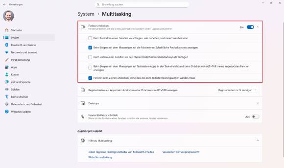 Stellen Sie zunächst aber sicher, dass Sie diese Methoden verwenden können. Navigieren Sie dazu in die Windows-Einstellungen im Startmenü und dort zu System. Wählen Sie Multitasking, Bild 1. Die wichtigsten Einstellungen finden Sie unter Fenster andocken, das aktiviert sein sollte. Im dort ausklappbaren Menü können Sie das Verhalten der Funktion zusätzlich nach Wunsch anpassen. Ist alles eingerichtet, können Sie loslegen.