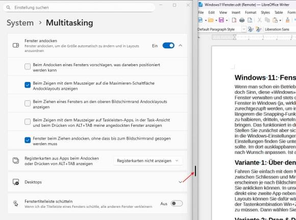 Ein Beispiel: Windowstaste+Linkspfeil bei einem Fenster, das nicht bereits angedockt wurde, dockt das Fenster links an. Drückt man die Tastenkombination noch einmal, wird das Fenster eine Bildschirmkante weitergereicht.