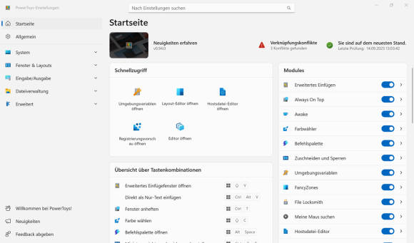 Die PowerToys bieten viele, teils sehr unterschiedliche Funktionen. Die aktuelle Version zeigt links mehrere Kategorien, in welche die einzelnen Funktionen eingebettet sind, Bild 1. In der Mitte sehen Sie den Schnellzugriff sowie wichtige Tastenkombinationen. Rechts daneben zeigt das Tool die aktuell aktivierten Module. Folgend ein paar unserer Favoriten: