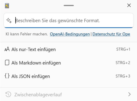 - Erweitertes Einfügen ist ein Werkzeug, das in die Zwischenablage kopierte Inhalte in andere Formate umwandelt. So sorgt es beispielsweise dafür, dass Sie einen Text von einer Webseite mit Ctrl+Alt+V ohne störende Formatierungen in Word einfügen können. Über Einstellungen öffnen lässt sich ein Zusatz-Tool von ChatGPT-Macher OpenAI hinzufügen. Anschliessend können Sie zum Einfügen von Inhalten Windowstaste+Shift+V drücken. Damit öffnen Sie ein spezielles Fenster, in dem Sie beschreiben können, wie der eingefügte Inhalt aussehen soll, Bild 2. Die KI formatiert den Inhalt wie gewünscht.