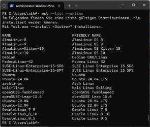 Befehl wsl --list --online. Ebenfalls herunterladen und nutzen können Sie unter anderem Debian, Fedora, verschiedene Suse-Varianten sowie das «Hacker-Linux» Kali, Bild 9.