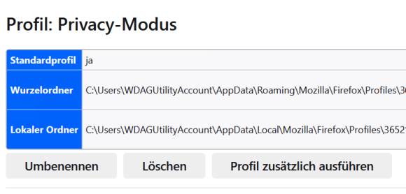 Der Rest ist simpel: Wann immer Sie den besonders geschützten Modus benötigen, öffnen Sie den Profilmanager über about:profiles und drücken bei Ihrem Arkenfox-Profil auf die Schaltfläche Profil zusätzlich ausführen, Bild 13. Firefox öffnet dadurch ein zusätzliches Fenster, in dem alle Sicherheitseinstellungen von Arkenfox aktiv sind. Da Arkenfox nicht nur den Webbrowser härtet, sondern auch einige Komfortfunktionen abschaltet, sollten Sie nicht immer in diesem Modus surfen. Verwenden Sie stattdessen Ihr normales Profil für den Alltag und die gesicherte Arkenfox-Variante für sensible Bereiche.