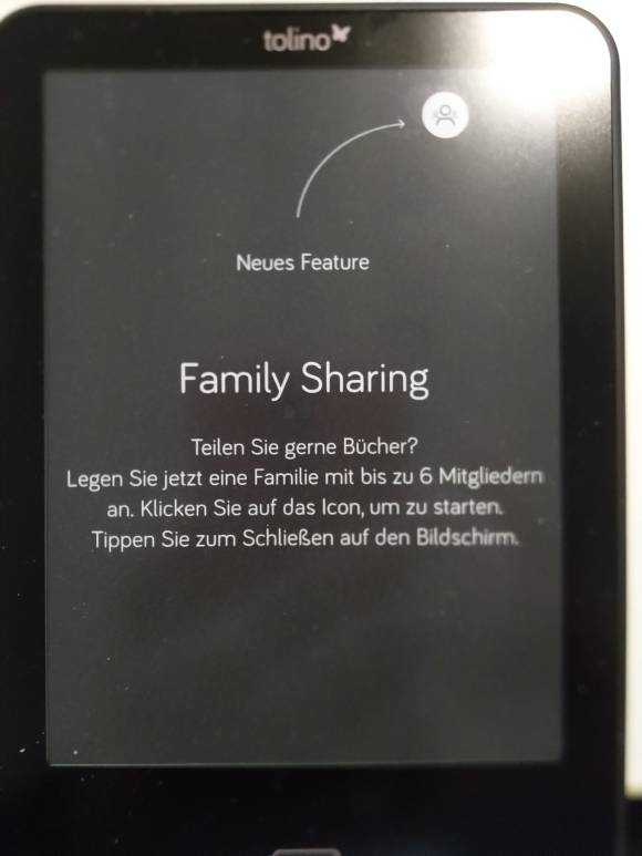 Die Installation von Version 14 hat geklappt, wenn der Tolino Sie mit dem Family Sharing begrüsst