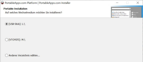 Lassen Sie die Auswahl auf Portabel und wählen Sie im folgenden Dialog den Partitionsbuchstaben aus, mit dem Ihr USB-Stick im Datei-Explorer zu finden ist, Bild 3. Wenn Sie sich nicht sicher sind, welches der Richtige ist, schauen Sie lieber noch einmal kurz nach.