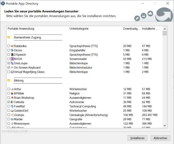 Bild 4: Im Portable App Directory legen Sie fest, welche Tools die PortableApps-Suite auf Ihrem USB-Stick installieren soll