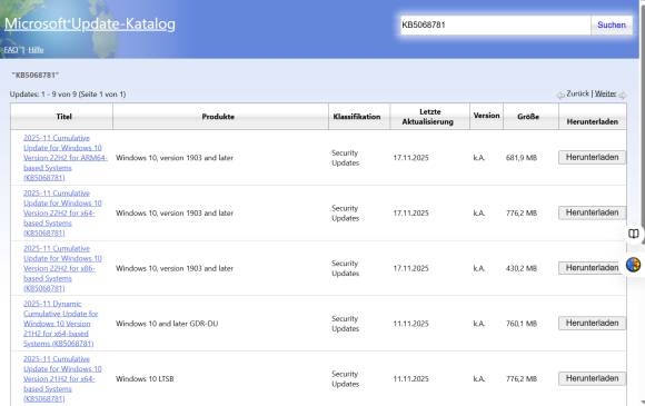 Bild 5: Im offiziellen Update Catalog finden Sie einzelne Updates