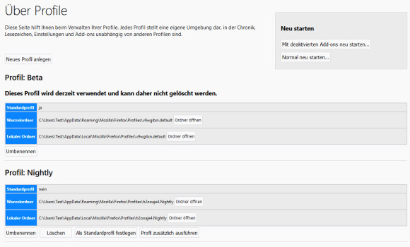 - Hier finden Sie Ihr aktuelles Nutzerprofil vor. Zur besseren Übersicht bietet es sich nun an, den Namen des vorhandenen Nutzerprofils an die dafür genutzte Firefox-Version anzupassen, wie beispielsweise "Beta". Über den Button "Umbenennen" lässt sich das Profil anpassen.