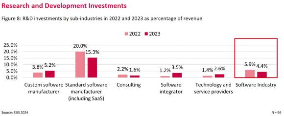 Die Investitionen in die Forschung und Entwicklung nehmen leicht ab (von 5.9 % im Jahr 2022 auf 4.4 % im Jahr 2023). Besonders die Hersteller von Standardsoftware investieren im Jahr 2023 deutlich weniger ihres Umsatzes in die Forschung und Entwicklung (15.3 %).
