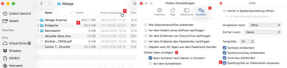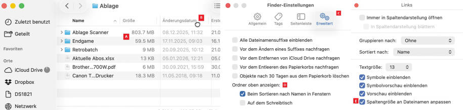 - Automatische Spaltenbreite. Es hat bis macOS 26.1 gedauert, aber jetzt ist sie da: Die Möglichkeit, die Spaltenbreite automatisch an den längsten Dateinamen anzupassen. Wählen Sie im Menü Darstellung den Befehl Darstellungsoptionen einblenden und aktivieren Sie die neue Option Spaltengrösse an Dateinamen anpassen E.