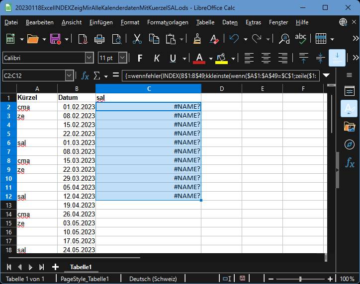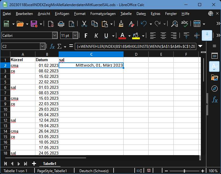Zu Anfang sieht noch alles bestens aus. Die Formel haben wir in C2 eingefügt und mittels Ctrl+Shift+Enter als Matrix-Formel erfasst. Das Resultat entspricht dem korrekten Datum, denn das Kürzel «sal» kommt in Spalte A tatsächlich erstmals beim 1. März vor.