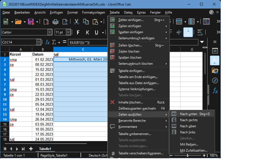 Lösung 2 – Tastenkombination: Wie Sie im Menü Tabelle/Zellen ausfüllen/Nach unten sehen, lautet das Tastenkürzel hierfür Ctrl+D (Strg+D). Sie können daher nach dem Markieren der Quell- und Zielzellen einfach Ctrl+D drücken. Auch das übernimmt die Formel korrekt.