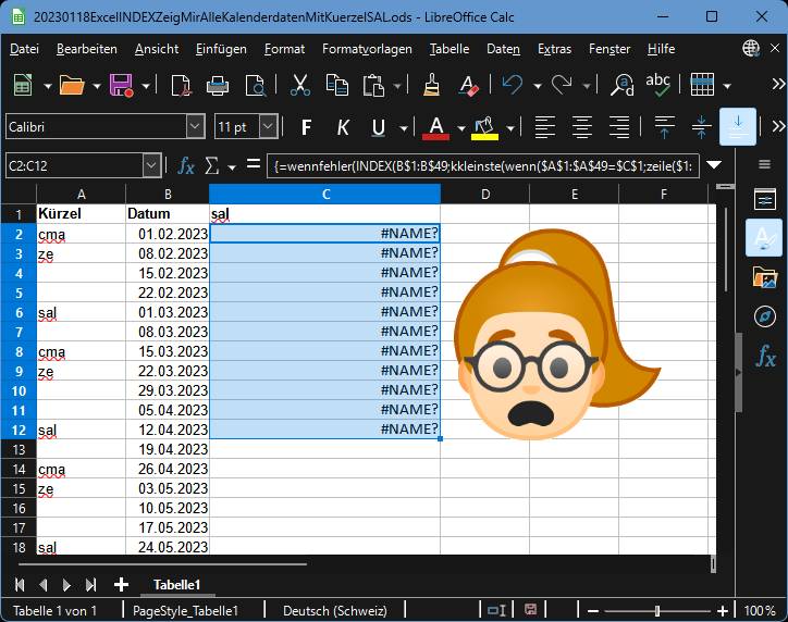 Letzten Freitag lasen Sie hier einen Excel-Tipp, bei dem eine Matrix- oder Array-Formel involviert ist. Normalerweise schaue ich mir bei Excel-Tipps immer auch an, ob und wie dasselbe auch in LibreOffice Calc klappt. Diesmal konnte ich aber nicht einfach ein «Funktioniert in LibreOffice genauso» anfügen, denn ich scheiterte kläglich kurz vor der Ziellinie: beim Kopieren der Formel!