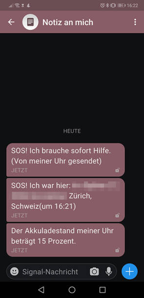 Mit unserem Bluetooth-Modell konnten wir via Wear-App die SOS-Funktion einrichten und uns selbst ein Test-SOS-SMS schicken (Bluetooth-verbunden).